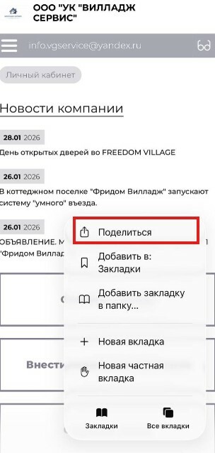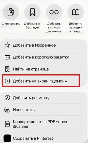 Нажмите на значек «Поделиться» и далее выберите из вплывающего меню "Добавить на экран "Домой".