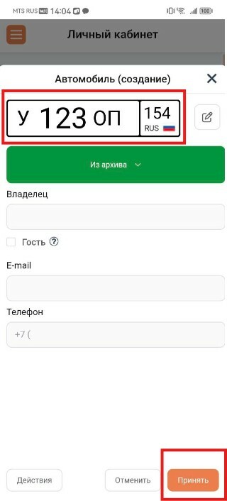 3. Далее в открывшемся окне внесите данные автомобиля, владельца автомобиля и нажмите кнопку "Принять";