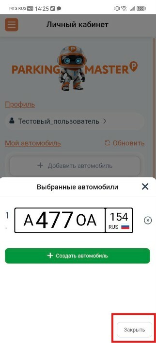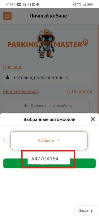 4. Далее на главном экране нажимаем "Мой автомобиль" в открывшемся окне выбираем "Выбрать" и нажимаем на гос. номер выпавшего из подменю автомобиля и нажимаем кнопку "Закрыть"